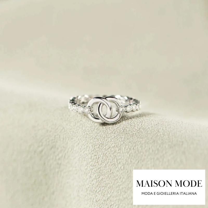 Questo raffinato anello è caratterizzato da un design con cerchi intrecciati, simbolo di un legame indissolubile e eterno. Il dettaglio pavé che impreziosisce la fascia dona un tocco di luce e raffinatezza, rendendolo un regalo perfetto per celebrare l'affetto speciale che unisce madre e figlia. Elegante e significativo, è ideale per esprimere amore e connessione in ogni occasione speciale.